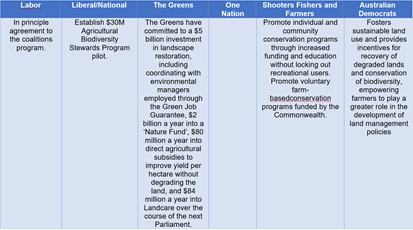 The National Farmers Federation have provided a policy comparison tracker for the Liberal, Labor and Greens policies by theme. This is a great tool when comparing positions on a range of agricultural and regional issues, highlighting significant differences and gaps and is available here.