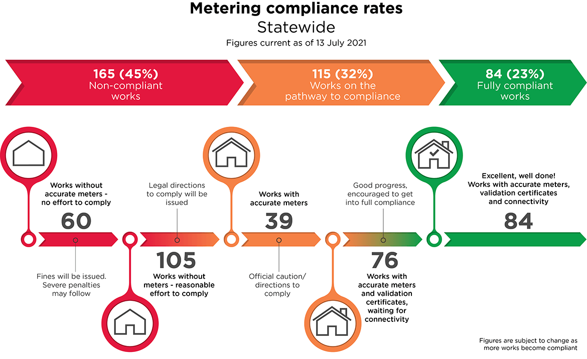 The Natural Resources Access Regulator have prepared the following 'Metering Compliance Rates' page to assist with the monitoring of progress as of 13 July 2021.