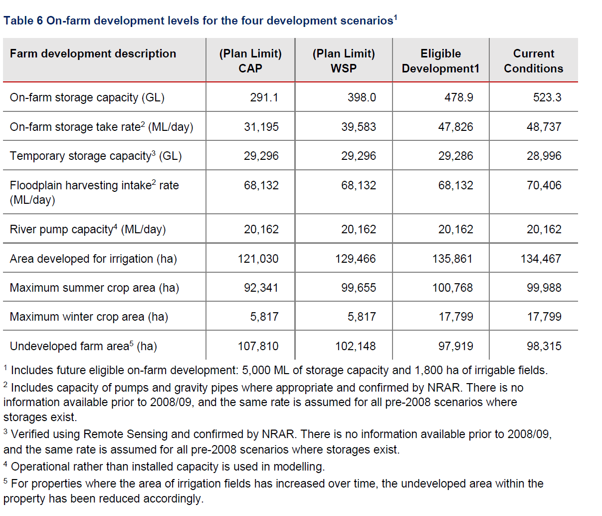 The NSW Government explains this in their FAQ section why are there so many on-farm storages that "Floodplain harvesting opportunity doesn't occur every year. Therefore, when considering development changes in the northern basin, 1 megalitre of increased storage does not equal 1 megalitre of additional floodplain harvesting. All changes in development conditions and resulting changes in diversions are shown transparently in our model reports on the website."