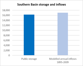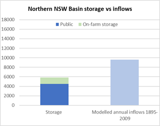 In the Northern Basin has a total public storage capacity of 28% of the Southern Basin, even with the known volume of on-farm storage. Even with the current best estimates of floodplain harvesting the percentage of inflows captured in the northern basin are much smaller than the southern.